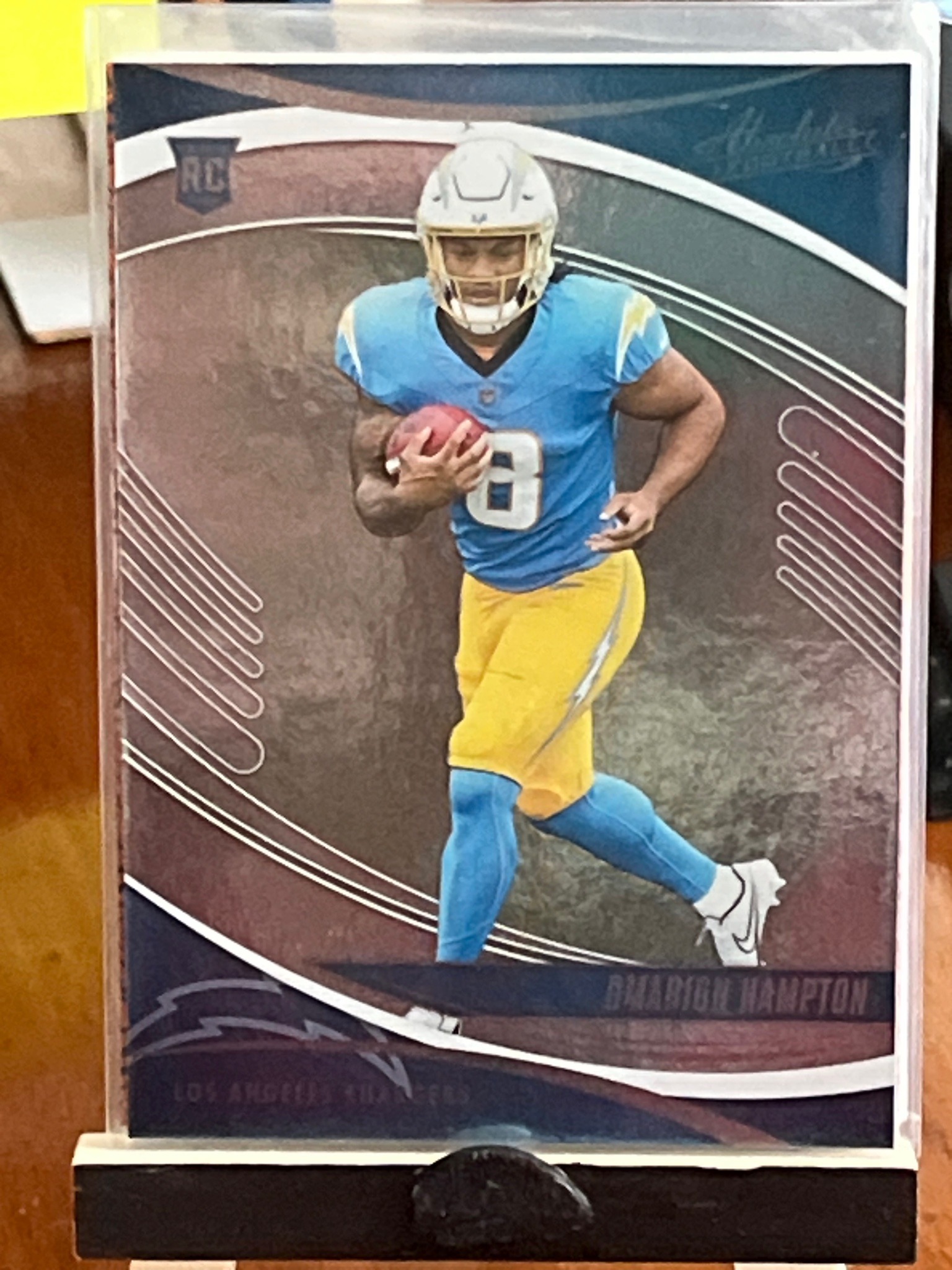 This is a standard-sized modern sports trading card featuring American football player D’Marion Hampton in his Los Angeles Chargers uniform. The card appears to be from the 'Absolute Football' product line produced by Panini. The front of the card displays a dynamic action shot of Hampton carrying a football, set against a multi-toned background featuring mahogany and deep navy hues with curved silver foil accents. The 'RC' (Rookie Card) logo is prominently displayed in the upper-left corner, signifying it is from his debut professional season. The player's name is printed on a dark translucent bar near the bottom, with 'Los Angeles Chargers' below it. The card exhibits a sleek, glossy finish common in high-end modern sets. Regarding condition, the card is currently presented in a flexible plastic protective sleeve (penny sleeve) and a rigid top-loader, resting on a small display stand. There is visible whitening and rough 'chipping' along the left vertical edge, which is a common manufacturing defect for thick-stock cards with dark borders. The corners appear relatively sharp, but the edge wear on the left would significantly impact a professional grading score. No manufacturer's stamp or serial numbering is visible on the front face, suggesting this is a base-level rookie card insert.