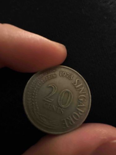 This is a circular cupro-nickel circulation coin from Singapore, dated 1973. It belongs to the first series of Singaporean coinage, often referred to as the 'Marine Series.' The reverse side, visible in the image, features a central denomination indicator '20 CENTS' prominently in a serif typeface. Flanking the left side is a stylized wreath of two stalks of paddy, symbolizing prosperity and the agrarian roots of the region. The top and right perimeter are inscribed with '1973 SINGAPORE.' The coin is struck with a reeded edge and has a silver-colored metallic finish typical of its 75% copper and 25% nickel composition. Based on standard specifications, this 1973 issue has a diameter of 23.6 mm, a thickness of 1.78 mm, and weigh approximately 5.66 grams. The condition appears to be 'Circulated' (Fine to Very Fine range). Significant surface wear is evident, resulting in softened details on the paddy stalks and the lettering. There is a noticeable dull grey patina and minor surface scratches consistent with decades of use. No major structural damage like bends or deep gouges are visible, though the rim shows slight smoothing. This specific design was produced between 1967 and 1985 before being superseded by the floral series.
