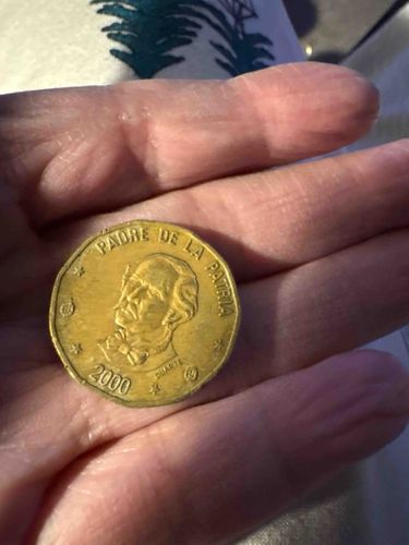 This is a 10 Pesos bimetallic-style circulating coin from the Dominican Republic, dated 2000. The obverse features the right-facing profile of Juan Pablo Duarte, one of the founding fathers of the Dominican Republic, encircled by the text 'PADRE DE LA PATRIA'. The coin has a distinct heptagonal (seven-sided) inner border, though the outer rim is circular. It is composed of a brass-plated steel or nickel-brass alloy, giving it a bright gold-tone or brassy appearance. Notable markings include the year '2000' at the bottom, the name 'DUARTE' below the portrait, and several small stars encircling the design. The condition shows visible circulation wear, including surface scratches, minor dings along the rim, and darkening of the metal (patina) in the recessed areas of the engraving. There are also signs of light oxidation or verdigris spots near the edge. The strike quality is standard for mass-produced currency, with clear but somewhat softened relief. This specific design was issued during the late 20th and early 21st century as part of the country's monetary system.