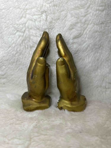 This item consists of a pair of vintage decorative figurines depicting hands in a prayerful position. Each piece is crafted from what appears to be cast plaster or chalkware, finished with an aged metallic gold or brass-toned paint. The figurines are approximately 5 to 7 inches in height and feature a stylized, somewhat blocky anatomical representation typical of Mid-Century religious decor. Notable features include the integrated square-cut bases which allow the hands to stand upright. Regarding condition, there is visible wear consistent with age, including significant paint loss and chipping, particularly along the edges of the bases and the fingertips, revealing the white primary material underneath. The surface exhibits a dull patina with some darkened areas and minor scuffing throughout. These mass-produced decorative items often date from the 1950s through the 1970s and were frequently used as bookends or bedside altar pieces. While no maker's marks are visible in the provided image, they are indicative of the religious kitsch style popular in mid-20th-century American households. The craftsmanship is functional rather than fine art, prioritized for accessible devotional use.