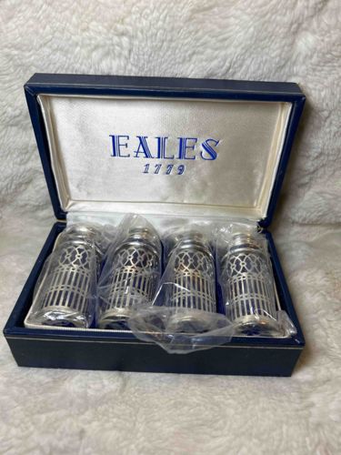 This is a vintage boxed set of four individual salt and pepper shakers produced by Eales 1779. The set features a classic combination of vibrant cobalt blue glass liners encased in silver-plated ornate metal filigree sleeves. Each shaker stands approximately 2.5 to 3 inches tall, showcasing a cylindrical body that tapers slightly toward the top. The silver-plated exterior is intricately designed with a geometric, cage-like pattern consisting of vertical bars and circular motifs at the shoulder, allowing the deep blue glass to remain visible. The shakers are topped with polished silver-toned screw caps featuring small perforations for dispensing contents. The set is presented in its original navy blue hinged presentation box, which is lined with white satin printed with the brand name 'EALES 1779' in blue block lettering. The shakers appear to be in excellent, possibly unused condition, as they remain individually wrapped in their original protective plastic sleeves. While the brand name alludes to a historical date of 1779, this specific style of silver-plated giftware was popularized in the mid-to-late 20th century. The craftsmanship is highly decorative, typical of vintage tabletop accessories intended for formal dining. No significant oxidation or tarnish is visible on the silver components through the packaging, and the display box remains structurally sound with minor shelf wear on the exterior.
