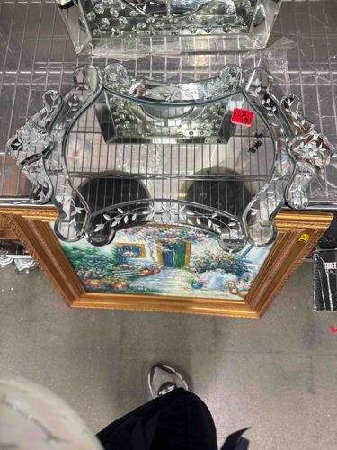 This is a decorative Venetian-style vanity tray, likely dating from the mid-to-late 20th century. The piece is constructed entirely of mirrored glass panels, featuring a central rectangular mirror base surrounded by an ornate, multi-scalloped border. Each of the curved perimeter panels is intricately wheel-etched with a delicate floral and foliate motif, characteristic of classic Murano glasswork. The edges are finished with a subtle bevel, and the panels are joined with small decorative metal rosettes or screws typical of this style of glassware. Physically, the tray exhibits a bright, reflective silvering. A notable feature is the shaped, outward-curling handles integrated into the mirrored frame. Condition-wise, the item appears generally well-preserved, though there is a visible red price tag or sticker on the upper right side which may leave residue upon removal. Close inspection suggests minor surface dust and generic wear consistent with retail display; however, no significant cracks, chips, or silvering loss (desilvering) are immediately apparent in the image. The craftsmanship indicates a refined decorative piece intended for use on a dressing table or vanity to display perfumes and toiletries.
