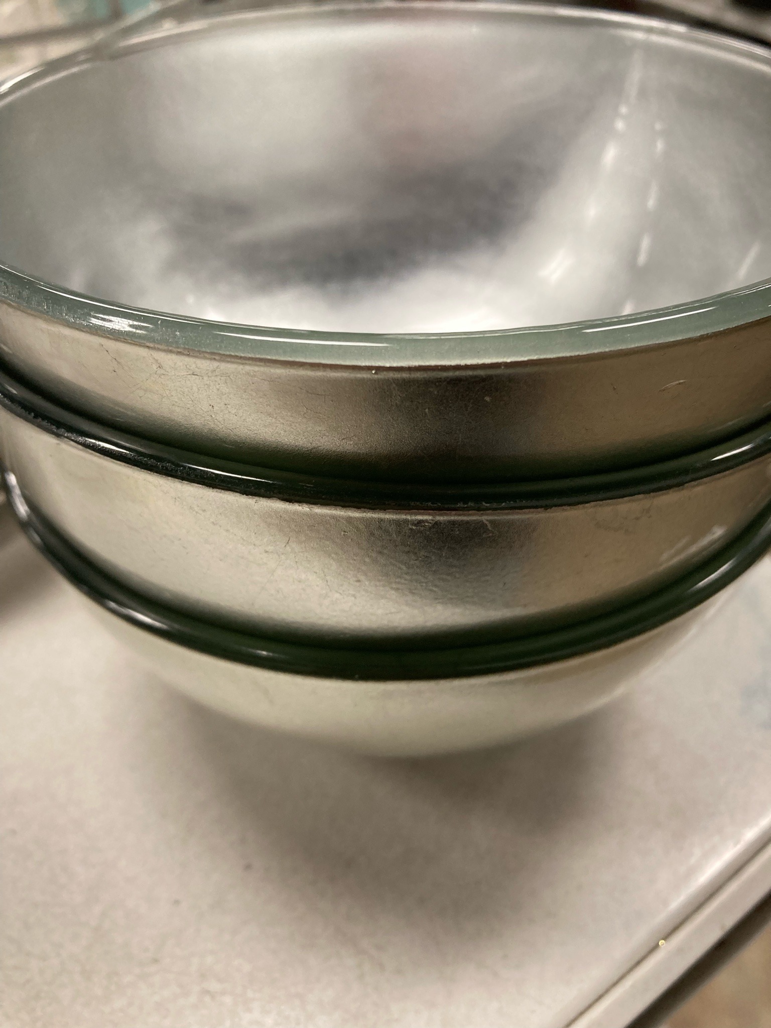 A set of three nested mixing bowls constructed from thick, transparent soda-lime glass, featuring a distinctive metallic silver treatment applied to the exterior surfaces. The bowls vary in diameter and are designed to store compactly within one another. The silver-tone finish has a textured, slightly matte appearance, suggesting either an electroplated application or a cold-painted leafing technique common in mid-century kitchenware. The rim of each bowl remains clear and polished, providing a visual border between the metallic exterior and the smooth, transparent interior. Upon close inspection, the exterior reveals significant signs of use, including visible surface abrasions, fine scratches, and areas where the silver coating has thinned or worn away, particularly around the edges and contact points. This wear pattern is indicative of regular kitchen use and contact with utensils or abrasive cleaning materials. While no specific maker's mark is visible in the provided view, the style is reminiscent of 20th-century glassware manufacturers like Pyrex or Anchor Hocking that occasionally produced decorative exterior-coated lines. The bowls represent functional industrial design from approximately the 1960s to 1980s, prioritizing heavy-duty construction with a decorative aesthetic flair.