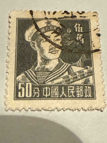 This is a rectangular postage stamp from the People’s Republic of China, specifically part of the 1955 'Military Post' (Jun Ren Tie Yong) series. The stamp features a central portrait of a sailor in the People's Liberation Army Navy, wearing a traditional white sailor's cap with a red star and a striped undersuit, holding a submachine gun. The artwork is executed in a monochrome black/dark grey lithographic or typography style over an off-white or yellowish paper base. The lower left corner displays the denomination '50分' (50 Fen), while the bottom horizontal border contains the Chinese characters for 'China People's Post'. The item shows distinct signs of circulation, most notably a heavy, partial circular black ink cancellation mark or 'postmark' sweeping across the sailor's face and upper right corner. The edges are perforated, though the perforations show some minor fuzzing and unevenness consistent with age and typical paper quality of the mid-20th century PRC. The paper has developed a slight creamy patina over several decades, though there are no visible major tears or repairs. The graphic design reflects the socialist realism art style prevalent in China during the Mao Zedong era, emphasizing national military strength. This stamp was part of a specific set issued for use by military personnel, which were later withdrawn and replaced, making them notable pieces for collectors of Chinese philately.