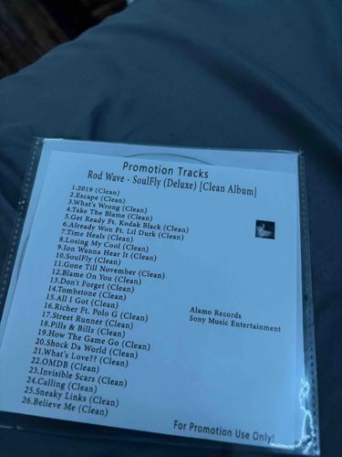 This item is a physical compact disc (CD) housed in a clear plastic protective sleeve, containing the deluxe edition of the album 'SoulFly' by American artist Rod Wave. This specific version is designated as a 'Clean Album,' meaning it has been edited for broadcast or radio standards to remove explicit language. The item features a white paper insert with black printed text detailing a tracklist of 26 songs, including collaborations with artists such as Kodak Black, Lil Durk, and Polo G. The layout is utilitarian, consistent with industry promotional materials rather than commercial retail packaging. Notable markings include the text 'Promotion Tracks' at the top, and 'For Promotion Use Only!' at the bottom right. The record labels 'Alamo Records' and 'Sony Music Entertainment' are credited on the right side of the sleeve. The condition appears to be relatively new, though the plastic sleeve shows minor surface reflectivity and handled edges. There is no visible artwork on this side, adhering to the minimalist style of advance industry pressings released around August 2021. The quality is typical of standard-grade promotional media used for radio DJs, reviewers, and music industry professionals.