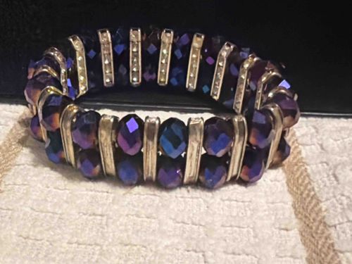 This is a contemporary costume jewelry stretch bracelet featuring a double-strand design. The piece is composed of faceted glass beads with an Aurora Borealis (AB) coating, which gives the dark purple/blue stones a multi-chromatic, iridescent shimmer when they catch the light. Between each pair of vertical beads are silver-toned metallic spacer bars. These spacers appear to be channel-set with tiny clear rhinestones or crystals, though some areas show signs of wear or missing stones upon close inspection. The construction utilizes elastic cords, allowing for a flexible fit that accommodates various wrist sizes. The metallic components show a duller patina, suggestive of a base metal with silver plating that has aged or worn over time. The craftsmanship is typical of mid-to-high-tier mass-produced costume jewelry, likely dating from the late 20th century to the early 2000s. There are no visible maker's marks or stamps in the image, which is common for this style of stretch-cord accessory. The overall condition appears fair to good, with the primary value lying in its decorative aesthetic and the reflective quality of the treated iridescent beads.