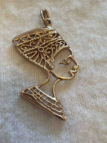 This item is a 14k or 18k yellow gold pendant featuring the iconic profile of the Egyptian Queen Nefertiti. The piece is constructed using a high-quality openwork or filigree-style technique, creating a delicate yet substantial silhouette. The crown (nehemet) is intricately detailed with scrolls and geometric fan-like motifs, while the neck is adorned with a stylized broad collar (usekh) containing a grid-like openwork pattern. The profile itself is rendered with a smooth, polished finish, showing a distinct almond-shaped eye, a straight nose, and contoured lips typical of Tel-el-Amarna period art revival jewelry. The pendant measures approximately 1.5 to 2 inches in height. It features a simple circular bail attached to a jump ring at the top of the crown for suspension on a chain. The gold displays a warm, rich luster consistent with higher karatage, though no specific hallmark is visible in the photograph. The condition appears to be excellent with a light natural patina and minimal surface scratches, suggesting mid-to-late 20th-century manufacture (circa 1970s-1990s). The craftsmanship shows careful attention to symmetry and line work, making it a fine example of Egyptian Revival jewelry popular in Mediterranean and Middle Eastern gold markets.