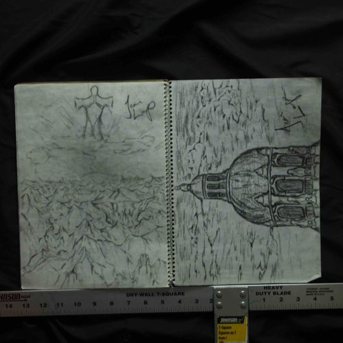 This item consists of two original graphite on paper illustrations contained within a standard spiral-bound sketchbook, attributed to the artist Jean Larry. The left-hand page features a surreal or abstract landscape with a central human-like silhouette appearing to emerge from or float above a textured, mountainous horizon. The right-hand page depicts a detailed architectural dome, reminiscent of classical or Renaissance structures, rendered with significant cross-hatching and shading to suggest depth and form. Both pages feature the artist's distinctive 'JLP' or 'JL' initials/monogram in large, bold graphite strokes. The paper appears to be a medium-weight, off-white sketchbook stock, showing slight yellowing consistent with age. Notable condition issues include minor smudging of the graphite, light corner curling, and slight fraying along the spiral perforated edge. The craftsmanship displays a confident use of line and varying pressure to create value, indicating a skilled hand. Based on the materials and style, these sketches likely date from the late 20th century to the early 21st century. The sketchbook is shown against a scale for reference, appearing to be approximately 9 to 12 inches in height.
