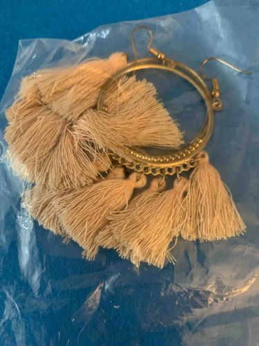 This pair of drop earrings features a large circular gold-toned metal hoop base, constructed with a decorative scalloped or beaded outer edge. Suspended from the lower portion of the hoop are five individual multi-layered tassels made of fine, cream-colored or beige synthetic silk or cotton embroidery thread. The earrings are designed with a 'shepherd's hook' or French wire ear wire for pierced ears, also in a gold-toned finish. In terms of construction, the metal appears to be a plated base metal, likely brass or zinc alloy, rather than solid gold. The decorative texture on the lower arc of the hoop provides a bohemian or ethnic-inspired aesthetic typical of fast-fashion jewelry from the mid-to-late 2010s. The tassels are gathered at the top with a thread wrap creating a bulbous head before fanning out into a fringe. Condition-wise, the tassels show signs of light fraying and storage wear, likely from being kept in the plastic bag shown in the image. There is a slight patina or dulling visible on the gold-toned metal, suggesting oxidation of the plating. No prominent designer marks are visible, indicating mass-market production intended for casual or festival wear. The craftsmanship is standard for commercial costume jewelry, prioritizing visual volume and movement over the use of precious materials.