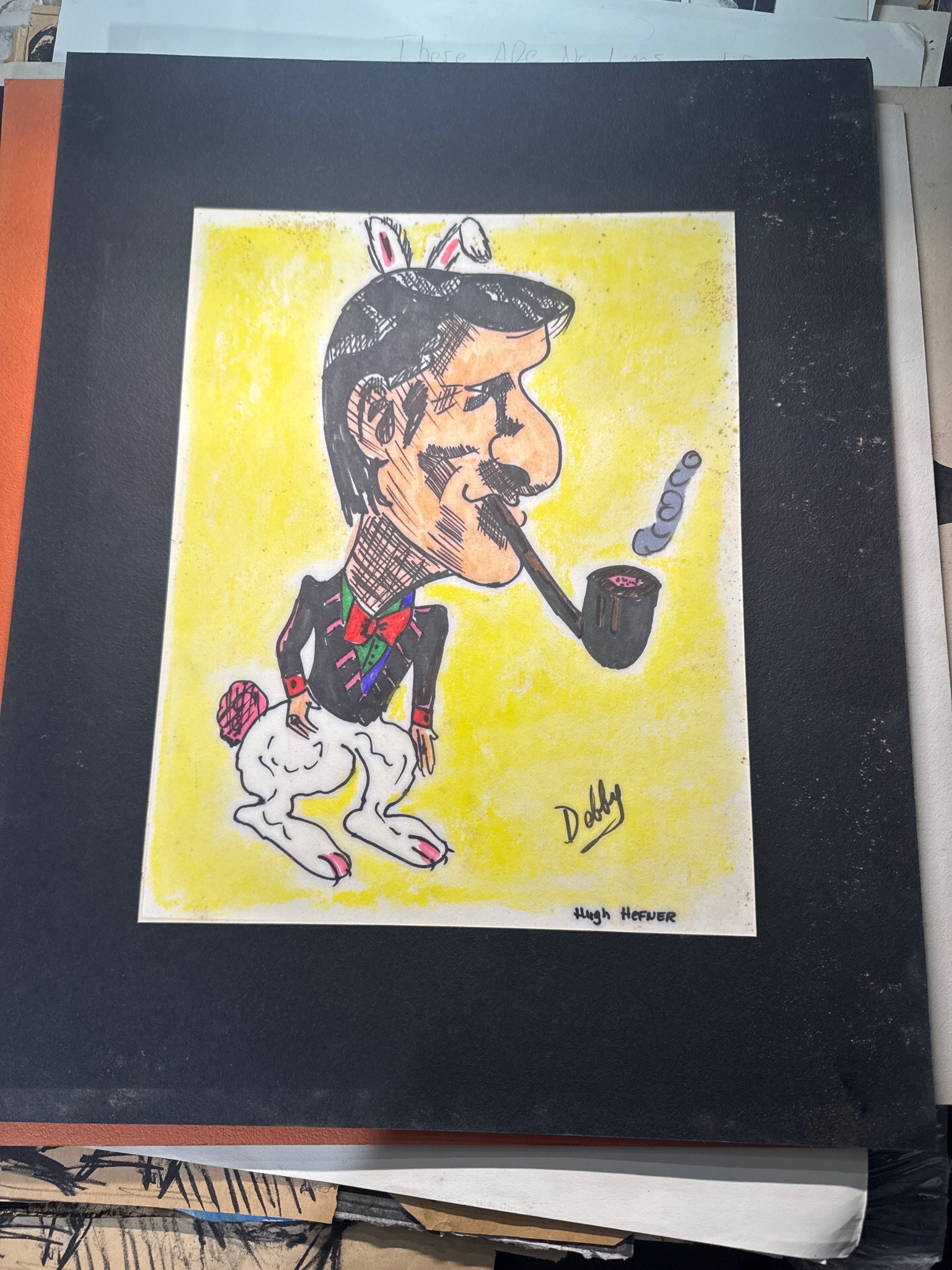 This item is an original illustrative caricature depicting Hugh Hefner, executed in a mixed media style utilizing black ink, markers, and likely colored pencil or pastel for the background. The artwork features Hefner hybridized with the iconic Playboy bunny, sporting rabbit ears, a fluffy tail, and rabbit hind legs while wearing a tuxedo jacket with a red bow tie. He is shown in profile smoking his signature pipe. The piece is characterized by a vibrant yellow stippled background which provides a high-contrast backdrop for the figure. The drawing measures approximately 8x10 inches and is presented within a simple black cardstock mat. The illustration is signed 'Dobby' in a stylized script in the lower right area of the yellow field, with 'HUGH HEFNER' inscribed in block letters on the bottom margin. The condition appears fair to good; there is visible surface wear and spotting on the black matting, along with some slight edge wear on the paper. The line work is bold and shows confident cross-hatching, suggesting a folk art or amateur editorial style from the late 20th century. The quality of the paper and the saturation of the pigments indicate it may have been created for personal use or a localized publication.