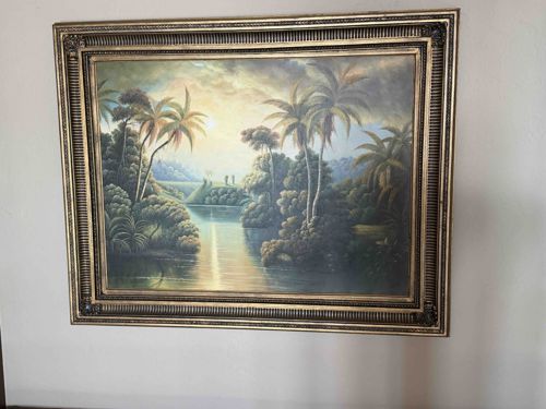 This item is a large-format landscape oil or acrylic painting on canvas, depicting a serene tropical river scene at either sunrise or sunset. The composition features a central body of water reflecting a bright, hazy light source, flanked by dense tropical vegetation including variety of palm trees and lush shrubs. The color palette is dominated by earthy greens, muted blues, and warm yellow-gold tones in the sky, creating a nostalgic, luminist atmosphere. The artwork is housed in a prominent, highly decorative gilded wood or composite frame. The frame features several tiers of molding, including a fluted or reeded section and ornate corner acanthus leaf flourishes in a classical revival style. The style of the painting is reminiscent of mid-to-late 20th-century decorative art, potentially inspired by the Florida Highwaymen or similar tropical realism movements. The condition appears fair to good from a distance, with no major visible tears or punctures, though there is a slight dullness to the varnish consistent with age. The frame shows some minor dust accumulation and light rubbing on the high points of the gilt finish. No artist signature is clearly visible in the provided image, suggesting it may be a high-quality commercial decorative piece from the 1970s or 1980s.