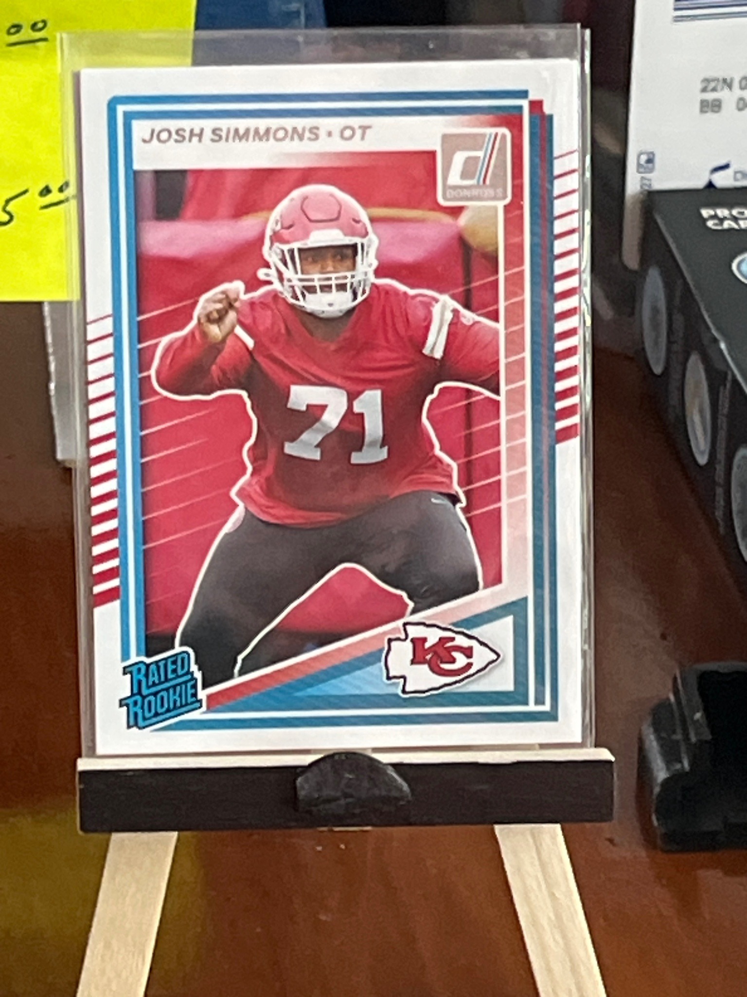 This is a modern collectible sports trading card featuring offensive tackle Josh Simmons of the Kansas City Chiefs. The card is part of the 'Donruss' brand by Panini, characterized by its iconic 'Rated Rookie' logo in the bottom left corner. The card construction is standard cardstock with a semi-gloss finish. The design features a multi-colored border scheme of white, light blue, and navy blue lines, with a central full-color action photograph showing Simmons in his red Chiefs jersey (number 71) and helmet in a blocking stance. The top right corner includes the classic Donruss 'D' logo. The bottom right features the Kansas City Chiefs arrowhead team logo. Condition-wise, the card appears to be in 'raw' (ungraded) condition, currently housed in a clear protective top-loader sleeve for preservation. The centering appears slightly heavy toward the left margin, but the colors remain vibrant with no visible surface scratches or corner dings through the plastic. This card represents a player from the 2020s era, likely from the 2021 or 2022 Donruss product line. The craftsmanship is typical of modern large-scale commercial printing, utilizing high-resolution digital imagery and precise offset printing for logos and text.