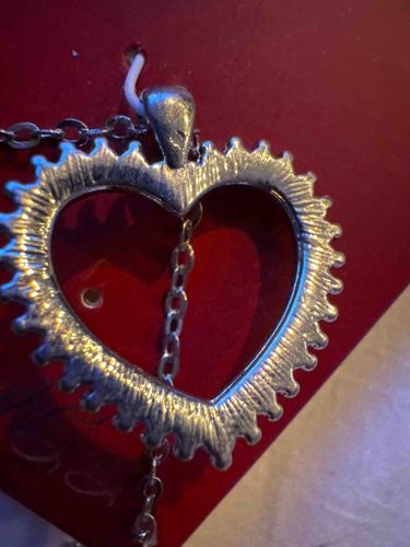 This item is a necklace featuring a large, silver-toned heart-shaped pendant with a decorative starburst or scalloped fringe edge. The pendant is constructed with an open-center design, measuring approximately 1.5 to 2 inches in width. The metal appears to be a silver-plated base metal or fashion-grade alloy, characterized by a bright, reflective finish and a textured back featuring a radial sunburst pattern. The pendant is attached to a standard cable chain via a tapered V-shaped bail. Upon close inspection, the metal shows signs of surface wear, including minor scratches, scuffs on the bail, and potential thinning of the plating where a dark patina or base metal is starting to show through. There are no visible maker's marks or hallmarks such as '925' or 'Sterling' apparent in the provided view, suggesting it is a contemporary costume jewelry piece, likely produced within the last 20 years. The craftsmanship is consistent with mass-produced fashion accessories, designed for aesthetic appeal rather than fine jewelry standards. The pendant is displayed against a red cardboard backing, often seen in retail packaging for seasonal or gift-marketed jewelry.