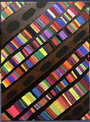 This is an abstract painting on what appears to be a canvas, characterized by a vibrant and somewhat erratic pattern of diagonal stripes. The overall color palette is highly diverse and saturated, with individual stripes of varying widths showcasing colors such as red, blue, green, yellow, orange, purple, pink, brown, and metallic gold or silver highlights. The stripes are arranged in several diagonal bands, separated by darker, possibly brown or black, diagonal sections. Within these darker sections, several uniform, solid black oval shapes are integrated, breaking the continuity of the striped pattern. These ovals are strategically placed, adding a contrasting element to the otherwise busy and colorful design. The brushwork appears to be textured, with visible strokes suggesting the use of acrylic or oil paints, giving the surface a slightly raised quality. The style is distinctly abstract, focusing on color, line, and shape without representing concrete objects. The painting's condition appears generally good, with no overt signs of damage, tears, or significant discoloration visible in the provided image. There are no discernible maker's marks, signatures, or stamps evident, making it difficult to attribute to a specific artist or period. The edges of the canvas are visible, suggesting it might be an unframed piece or a gallery-wrapped canvas. The aesthetic suggests a contemporary, possibly modern, art piece, likely created in the late 20th or early 21st century.