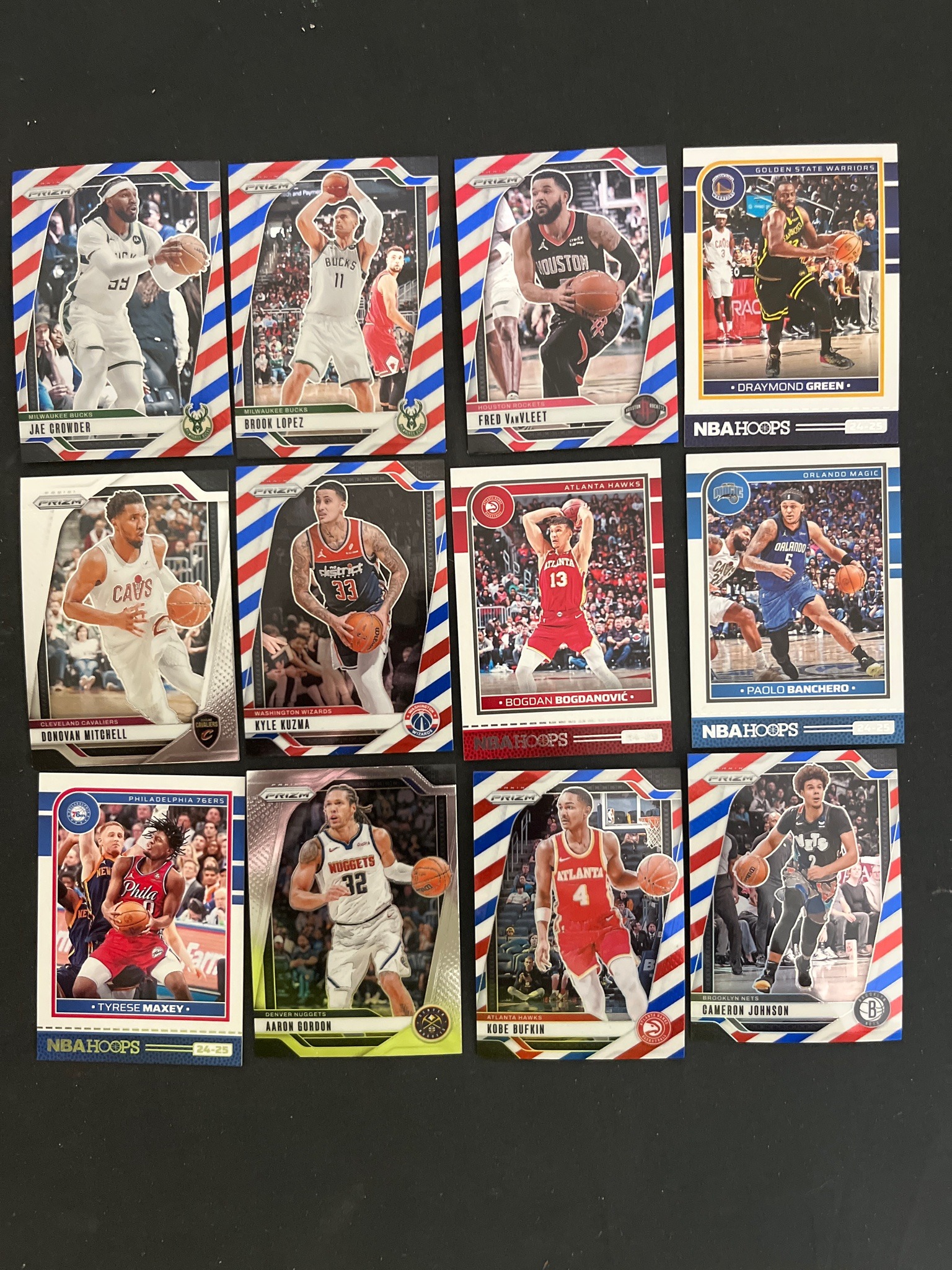 A collection of 11 modern basketball trading cards featuring various NBA players. The lot primarily consists of Panini Prizm and NBA Hoops brands. Notable among these are several 'Red White and Blue' Prizm parallels, which feature a distinctive barber-pole style diagonal stripe pattern on the borders. Featured players include Jae Crowder, Brook Lopez, Fred VanVleet, Draymond Green, Donovan Mitchell, Kyle Kuzma, Bogdan Bogdanovic, Paolo Banchero, Tyrese Maxey, Aaron Gordon, and Kobe Bufkin (appearing to be a rookie card variant). The cards are standard 2.5 by 3.5 inches in size and are constructed from premium cardstock with high-gloss finishes. The Prizm cards exhibit a metallic, refractive 'prizm' sheen, while the NBA Hoops cards feature a more traditional matte and gloss design with blue and red borders. The cards appear to be in Near Mint to Mint condition, showing sharp corners, straight edges, and vibrant colors without any visible surface scratching or creasing. They represent the 2024-25 release cycle, indicated by the 'NBA Hoops 24-25' branding on several cards. The collection shows high-quality contemporary printing techniques with crisp photography and detailed gold and silver foil stamping for logos and player names.