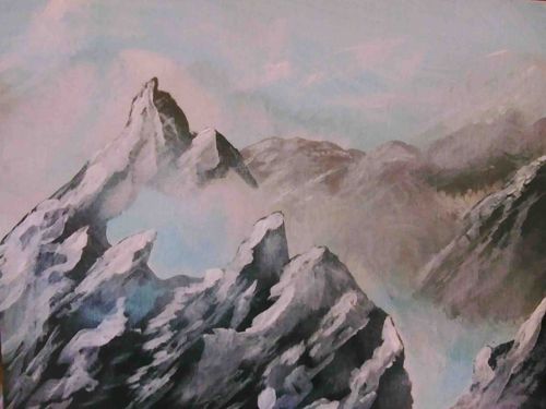 This is an original landscape painting executed in what appears to be acrylic or gouache on a textured surface, possibly canvas or heavy art board. The composition features dramatic, jagged mountain peaks rendered with a monochromatic focus on grey, slate, and white tones to represent rocky crags and snow cover. The foreground and mid-ground peaks show aggressive, gestural brushwork with visible impasto in the white highlights, suggesting a mid-to-late 20th-century contemporary style. A soft, hazy atmospheric effect is achieved in the background using a palette of muted lavender, pale blue, and misty pink, creating a sense of depth and morning light. The painting demonstrates a confident use of light and shadow to define the sharp geological facets of the mountain range. No visible signature or maker's mark is discernible in the provided image. The overall condition appears fair, though the image quality makes it difficult to assess fine surface craquelure or minute losses. The style is reminiscent of mid-century amateur or student wilderness studies, characterized by a bold, expressive approach to natural forms rather than photorealism.