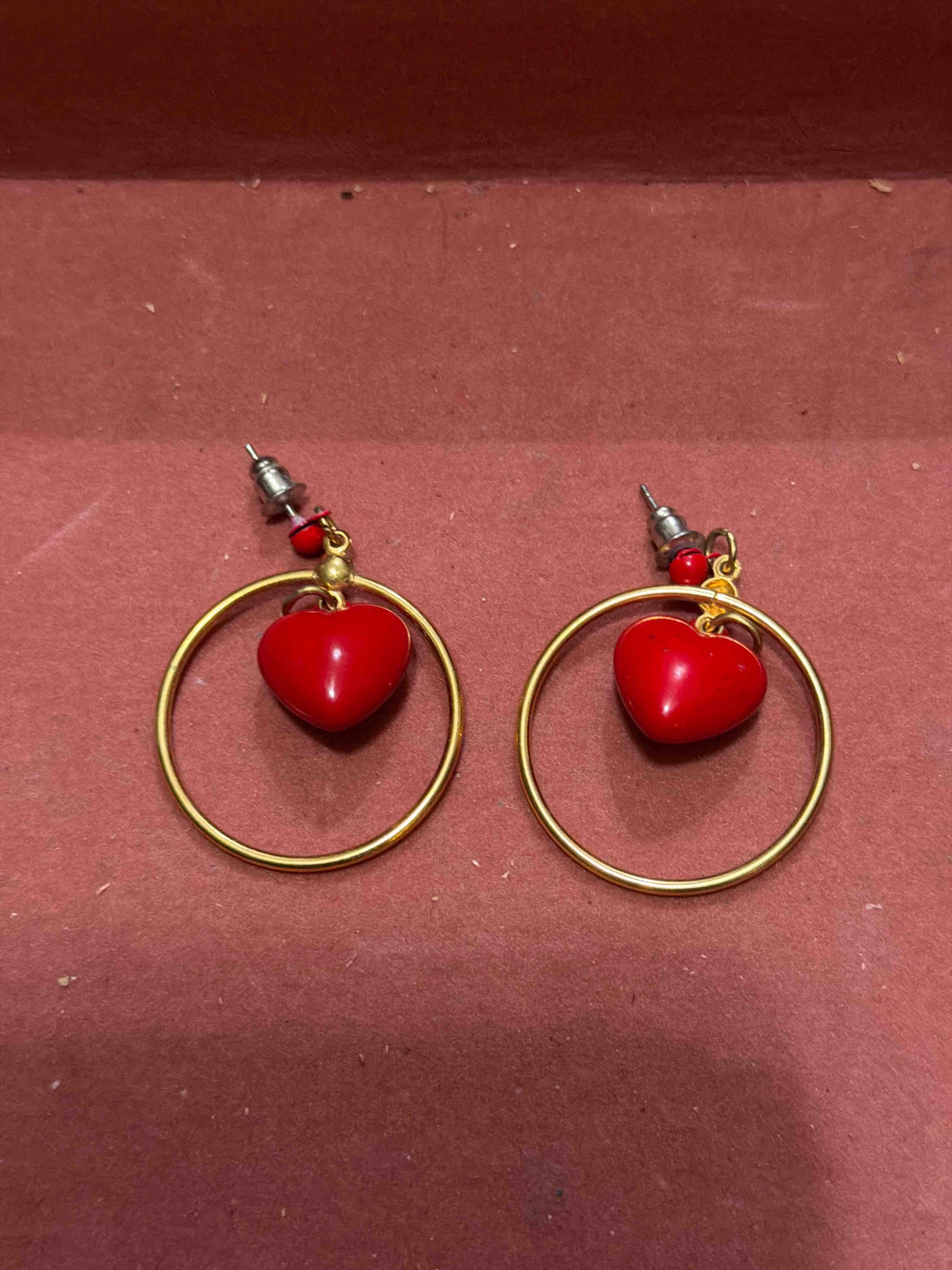 A pair of contemporary fashion earrings featuring a gold-finish metal construction. Each earring consists of a large, circular hoop approximately 30-40mm in diameter, suspended from a stud-style post with a decorative gold-tone bead. Dangling within the center of each hoop is a puffy, three-dimensional red heart charm. The hearts appear to be made of polished resin or acrylic, exhibiting a vibrant red hue and a smooth, reflective surface. The assembly includes small gold-tone jump rings and a tiny red bead accent between the heart and the post. The closure mechanism is a standard butterfly clutch on a silver-toned metal post. The construction suggests mass-produced costume jewelry rather than fine jewelry, likely dating from the late 20th century to the present. The condition shows moderate wear; notably, there is visible metal fatigue and slight discoloration on the posts, and some minor surface abrasions are present on the red heart charms. No maker's marks or hallmarks were observed, indicating a generic fashion brand origin. The style reflects a playful, romantic aesthetic common in accessible boutique jewelry segments.