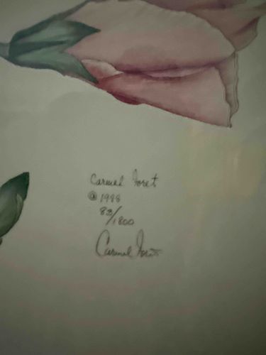 This item is a limited edition offset lithograph or fine art print featuring a botanical illustration of a pink rose bud or similar floral subject. The artwork demonstrates a soft, watercolor-like aesthetic with delicate gradations of dusty pink and mauve in the petals, complemented by muted sage green sepals and leaves. The piece is physically marked with the artist's name 'Carmel Foret' in printed script, a copyright date of 1988, and a hand-written edition number of 83/1800. Below the edition number, there is a distinct hand-signed signature by the artist, Carmel Foret, which adds significantly to its provenance and value. The paper appears to be a heavy-weight art stock with a matte finish, typical of high-quality late 20th-century commercial art prints. Regarding condition, the paper shows a slight yellowish tint consistent with natural aging or exposure to light (toning/foxing), which suggests it may not have been stored under UV-protective glass. The craftsmanship reflects the popular 'shabby chic' or romantic botanical style of the late 1980s. There are no immediate signs of physical tears or creases visible in this detail view, though the overall evenness of the paper suggests it has been kept flat.