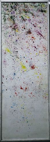This is an untitled original abstract painting created with a splatter or 'drip' technique, reminiscent of the Action Painting movement. The work features a vertical rectangular composition on canvas or paperboard, enclosed in a minimalist thin silver-toned metallic frame. The palette is a diverse range of primary and secondary colors including red, yellow, blue, green, and deep purple/burgundy, applied in varied densities of droplets and fine sprays across a predominantly pale, off-white background. The upper portion of the work shows a higher concentration of darker pigments, slowly thinning out toward the bottom edge to create a sense of gravitational movement. Physically, the piece shows some signs of age; there is a visible indentation or ripple in the support material on the right-hand side, suggesting potential moisture exposure or structural warping of the substrate. The frame exhibits minor surface scuffing but remains intact. While the artist is unknown and no signature is immediately visible on the face, the style suggests a mid-to-late 20th-century origin. The spontaneity of the paint application combined with the controlled palette indicates a practiced hand in abstract expressionism, prioritizing texture and visual energy over figurative representation.