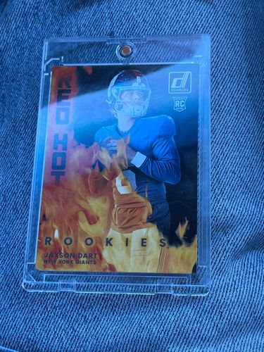 This item is a modern trading card featuring Jaxson Dart, encased in a magnetic one-touch protective holder. The card design is characterized by a 'Red Hot Rookies' motif, featuring a flame-like graphic overlay on the left side and the bottom edge, with a blue-and-orange color palette. Notably, the card features several unconventional elements: it identifies Jaxson Dart as a member of the 'New York Giants,' which is inaccurate as Dart played for USC and Ole Miss in college and has not been drafted by the Giants, suggesting this is a custom art card, a prototype, or a fantasy mock-up rather than a standard licensed release from Panini's Donruss line. The top right corner displays a Donruss logo and a 'RC' rookie shield. The physical construction appears to be standard cardstock with a glossy or light holofoil finish. Condition-wise, the corners appear sharp through the case, and the centering seems relatively balanced, though the lighting in the photo makes a definitive surface assessment difficult. There are no visible signs of chipping or edge wear, and the card's orientation is vertical. The craftsmanship mimics professional sports cards, but the team designation is a significant anomaly that defines its niche as a custom collectible.