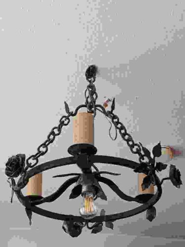 This is a vintage multi-light chandelier crafted from heavy black-painted iron, likely wrought or cast, featuring a prominent Gothic or Art Nouveau-inspired floral motif. The fixture is constructed around a sturdy circular metal hoop supported by three heavy-gauge link chains that meet at a central apical loop. The decorative highlight of the piece is the intricate metalwork depicting open-bloom roses and tapering leaves that are mounted along the circumference of the ring. It features three upward-facing candle-style light sockets with beige-toned candle covers (sleeves) and a central downward-facing socket housing a modern filament-style Edison bulb. The metal surface exhibits a matte black finish with minor signs of age-appropriate patina and slight surface oxidation, particularly visible on the leaf edges and chain links. The construction suggests late 19th-century to mid-20th-century craftsmanship. The quality is indicated by the three-dimensional depth of the metal petals and the substantial weight implied by the chain gauge. While no maker's mark is visible in the image, the style and manual assembly of the floral elements suggest a custom or light-industrial artisanal production. The electrical wiring is visible along one of the chains, suggesting it may have been re-wired or updated for modern use.