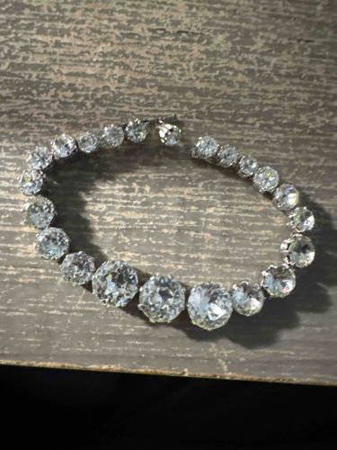This is a vintage-style tennis bracelet featuring a graduated design where the center stones are significantly larger than those near the clasp. The bracelet is composed of approximately 20 round-cut colorless stones, likely paste (lead glass) or high-quality cubic zirconia, though their specific faceting suggests mid-20th-century costume jewelry production. The stones are secured in silver-toned metal collet settings, each held by multiple fine prongs. The metal appears to be a rhodium-plated base metal or sterling silver, showing a bright, reflective finish typical of mid-century fashion jewelry. The construction involves individual articulated links that provide flexibility on the wrist. Notable features include the symmetrical graduation of stone sizes and a traditional fold-over or tongue-and-groove clasp, visible at the top. Condition-wise, the stones appear to retain good brilliance with no visible 'dead' or yellowed spots, although minor surface abrasions consistent with age may be present upon closer inspection. The setting shows no significant tarnish or metal loss. This style is reminiscent of the Art Deco or Retro periods (circa 1940s-1950s), frequently styled as 'diamond imitators' for formal evening wear. The craftsmanship is tidy, with uniform prongs and smooth articulation between the individual stone housings.