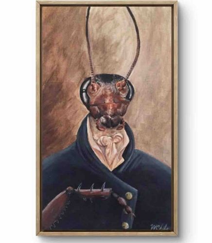 This is a unique oil painting on canvas featuring an anthropomorphic insect, likely a cricket or grasshopper, rendered in the style of a formal 18th or 19th-century Regency portrait. The subject is depicted from the chest up, wearing a dark navy or black double-breasted coat with gold-toned buttons and a crisp white cravat or jabot. The insect's head is highly detailed with rich brown and rust tones, prominent compound eyes, and long, delicate antennae that extend nearly to the top of the frame. One spiked leg is visible in the lower-left foreground, suggesting a hand resting across the chest. The background consists of a soft, mottled beige and brown wash, mimicking historical studio backdrops. The brushwork appears deliberate with a focuses on the texture of the chitin and the fabric of the clothing. The painting is housed in a simple, slim light wood or gold-toned floater frame. There is a signature in the bottom right corner, appearing to read 'W. Chile' or something similar. The overall condition appears excellent with no visible cracking, staining, or canvas sagging, suggesting a contemporary creation designed to evoke a surrealist take on historical fine art.
