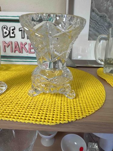 This item is a clear, pressed glass vessel, likely a celery vase or a spooner, characterized by its wide flared mouth and integrated three-footed base. The construction features a heavy, thick-walled transparent glass with a mold-blown or pressed texture. The exterior is decorated with an intricate geometric pattern including deep-cut diamond points (hobnail or sawtooth style) and starburst motifs that provide significant light refraction. The vessel tapers sharply at the waist before expanding into a bulbous lower section supported by three distinct scroll-form feet. Its style is indicative of Late Victorian or Early American Pattern Glass (EAPG), likely dating from the late 19th to early 20th century. The glass appears to have good clarity with significant brilliance, though minor manufacturing flaws like air bubbles or shear marks may be present upon closer inspection. Condition-wise, it appears well-preserved with no large chips or cracks visible, although some surface scratching and 'flea bites' on the sharp edges of the pattern are expected with age and utility. The craftsmanship shows a high degree of detail in the mold work, designed to mimic expensive leaded crystal of the era.