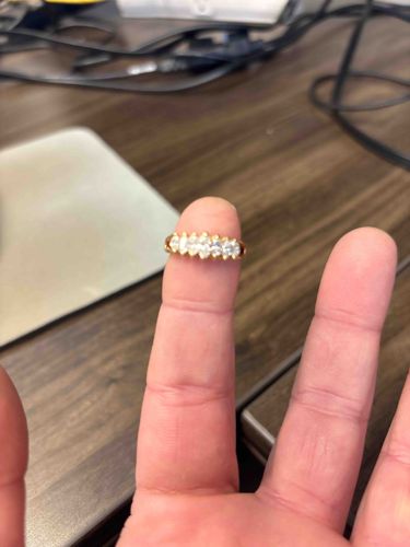 This item is a contemporary-style fashion or anniversary ring featuring five marquise-cut gemstones, likely diamonds, set horizontally across the top of the band. The stones appear to be near-colorless with good clarity based on visible light refraction and are secured in a multi-prong setting, possibly 14k or 18k yellow gold. The marquise cuts are arranged in a 'side-by-side' layout, creating a tapered visual effect along the finger. The metal displays a high-polish finish with a warm yellow hue characteristic of gold alloys. While specific hallmarks or maker's marks are not visible from this angle, the gemstone orientation suggests a late 20th-century to early 21st-century aesthetic, common in bridal and anniversary jewelry from the 1980s through the early 2000s. The ring appears to be in good used condition, though minor surface scratches on the shank and slight loosening of the prongs are typical for a piece of this age. Further inspection under magnification would be required to verify stone weights, color grades, and identifying stamps on the interior of the shank.