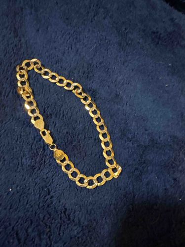 This item is a 14K yellow gold curb link bracelet, likely measuring between 7 to 8 inches in length. The construction features interlocking circular or slightly oval links that have been flattened and twisted to lay flush against the skin, a classic hallmark of the curb or Cuban link style. A distinguishing feature of this specific piece is the 'diamond-cut' texture applied to the surface of each link. These precision-angled notches are designed to catch and reflect light, giving the yellow gold a high-brilliance, shimmering effect that mimics the sparkle of gemstones. The metal exhibits the characteristic warm, saturated yellow hue associated with 14-karat gold alloy. The bracelet is secured with a traditional lobster claw clasp, which is preferred for its durability and security. Adjacent to the clasp, there is a prominent teardrop-shaped end cap or 'tag' that appears to be stamped with a '14K' hallmark indicating its gold purity. The overall condition appears to be excellent with no visible signs of broken links, stretching, or significant metal fatigue. The surface shows a bright polish with sharp diamond-cut facets, suggesting relatively light wear. This style is consistent with late 20th-century to contemporary jewelry manufacturing techniques, specifically utilizing machine-made precision for the diamond-cutting and link uniformity.
