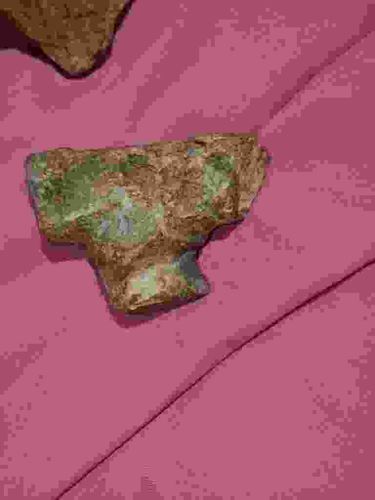 This artifact is a lithic projectile point, likely a stemmed or bifurcated variant, crafted from a chert or flint-based stone. The object exhibits a primarily brownish-tan body with notable patches of green surface coloration, which may indicate mineral staining, presence of copper oxides, or lichen growth depending on the burial environment. The piece shows evidence of bifacial pressure flaking, though the edges appear heavily weathered and rolling. The base features a distinct contracting or slightly expanding stem, while the shoulder is asymmetrical, suggesting a fracture across the blade. The surface texture is rough and pitted, indicating significant environmental exposure and chemical weathering over a long period. No modern tool marks are visible, pointing toward ancient manufacture. The piece likely dates to the Archaic period based on the general morphology of the stem and shoulder junction. Condition is poor to fair, as it is a fragment lacking the distal tip. The patina is thick and consistent across the flaked scars, suggesting the piece has not been recently reworked. The lack of secondary retouch suggests it may have been a discarded preform or a tool that suffered a terminal impact fracture during use.