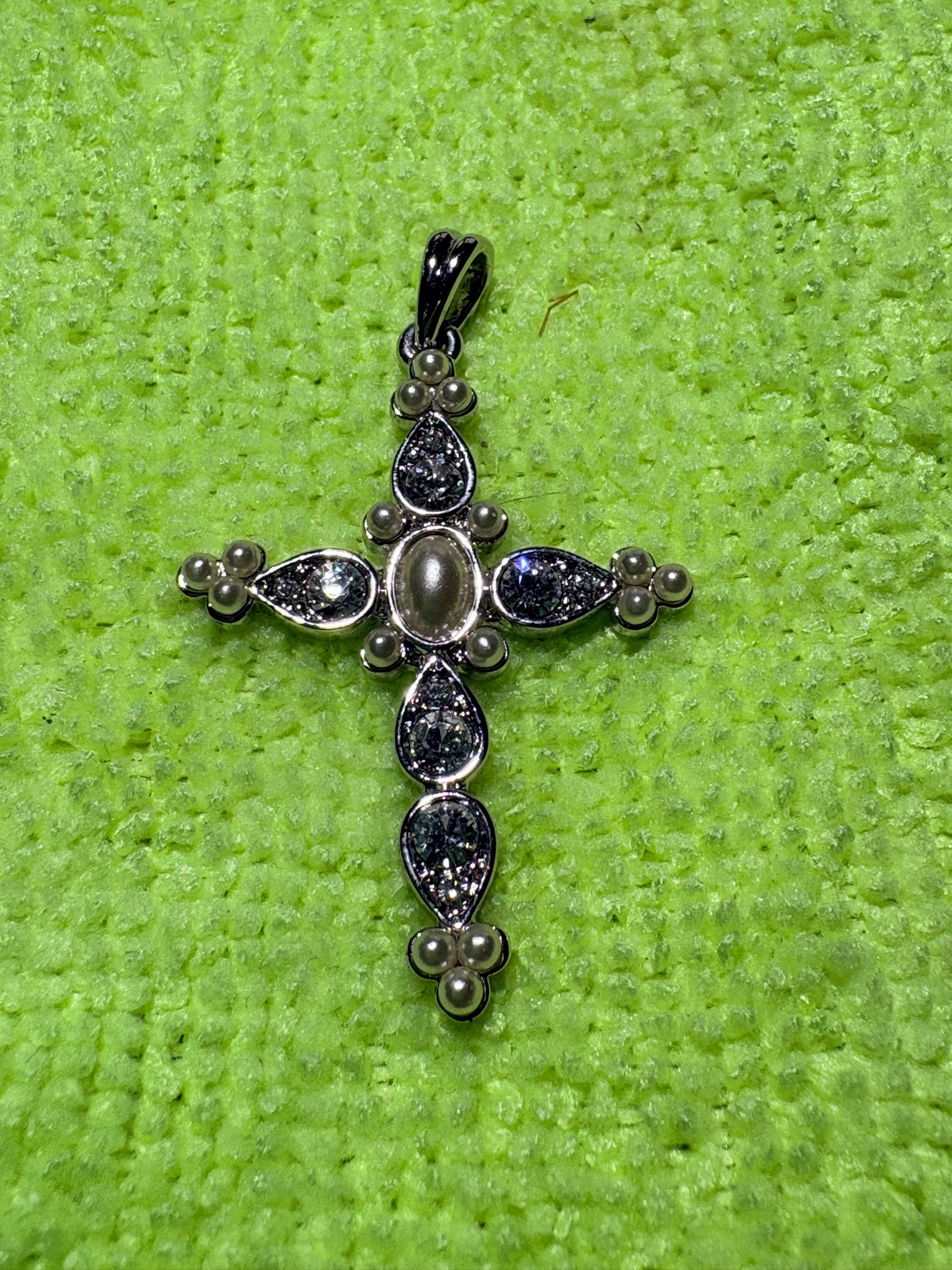 Ornate Silver-Tone Crystal and Faux Pearl Cross Pendant