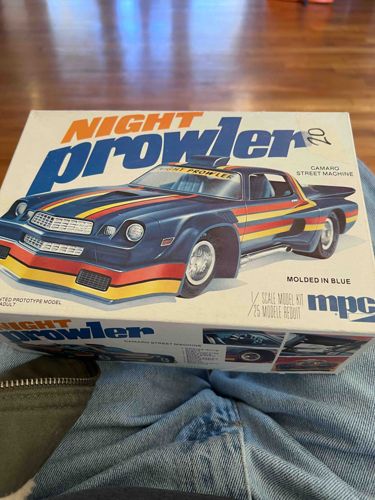 This is a vintage 1/25 scale plastic model kit of the 'Night Prowler' Camaro Street Machine, produced by the Model Products Corporation (MPC). The item features vibrant box art depicting a customized late-1970s Chevrolet Camaro with a wide-body kit, side-exit exhausts, a roof scoop, and a distinctive multi-color stripe package in yellow, orange, and red over a deep blue body. The box indicates the kit is 'Molded in Blue' and includes both English and French text ('Modèle Réduit'), signifying its distribution in the North American market. The branding features the classic MPC logo and bold 'NIGHT prowler' typography typical of late 1970s or early 1980s hobby kits. Regarding condition, the cardboard box shows visible signs of shelf wear, including compression on the top surface, softened corners, and light age-toning. A handwritten price or stock marking '20' is visible on the upper right corner. The box remains structurally intact, though its ultimate value would depend on whether the internal contents are complete, unbuilt, and still on their original plastic sprue trees. These kits are prized by collectors for their period-correct 'Street Machine' styling and historical significance in the car modeling hobby.