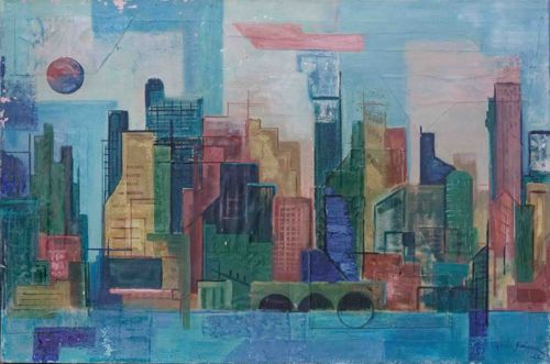 This original untitled painting by an unknown artist depicts an abstract urban skyline, likely dating from the mid-20th century (circa 1950s-1960s). The artwork features a complex arrangement of vertical rectangular forms representing skyscrapers, rendered in a palette of muted blues, greens, ochres, and earthy reds. The sky is a multi-tonal light blue with a prominent circular red and blue celestial body in the upper-left quadrant. The construction involves layered oil or acrylic paint on a canvas or panel support, utilizing a semi-cubist, geometric style with visible linework that suggests architectural details and bridges. The paint application varies from thin washes to more opaque, textured blocks, creating a sense of depth and atmospheric perspective. Notable features includes a rhythmic repetition of arches at the base of the skyline and a horizontal 'floating' pink element in the sky. The condition appears fair to good for its age, with visible surface grime, some potential pigment fading, and minor edge wear consistent with aging. The craftsmanship displays a sophisticated understanding of balance and color theory typical of the mid-century modern aesthetic, though no clear signature is visible in the provided image.