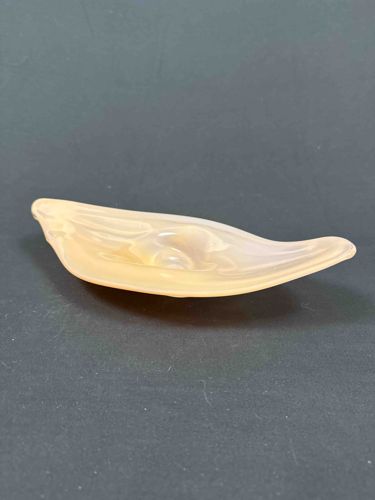 This exquisite item is an organic, biomorphic art glass bowl, likely produced in the mid-20th century (circa 1950s-1960s). It is crafted from hand-blown glass, featuring a subtle, translucent peach or amber hue with delicate internal creamy-white swirls, characteristic of the 'latticino' or 'sfumato' techniques found in Italian glassmaking. The bowl's form is elongated and fluid, with asymmetrical folded edges that create a dynamic 'wing' or bird-like silhouette. It stands on a slightly raised, integrated circular base that provides stability while maintaining the object's airy profile. The glass displays a high-gloss finish with a beautiful play of light through its translucent body. Upon close inspection, the craftsmanship is evident in the smooth, polished edges and the seamless integration of colors within the glass matrix. While no specific maker's marks are visible in this view, the style strongly suggests Venetian origin, specifically the Murano region. The piece appears to be in excellent vintage condition, showing no visible chips, cracks, or significant surface scratches, which is rare for glass of this age. Its minimalist yet expressive design makes it a quintessential example of Mid-Century Modern decorative art.