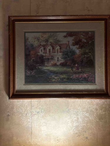 This item is a framed landscape print depicting a scenic two-story cottage or manor house nestled among lush, autumnal foliage. The composition features a prominent stone or white-painted masonry building with multiple gables and dormers, situated behind a manicured green lawn and surrounded by mature trees in shades of deep red, orange, and dark green. The artistic style is reminiscent of late 19th-century or early 20th-century American or English pastoral realism, often seen in the works of artists like Thomas Kinkade or within the tradition of romanticized rural life. The artwork is presented within a multi-tiered presentation: it is set against a thick, textured beige or taupe mat, which is further encased in a traditional stepped wooden frame. The frame features a dark mahogany or walnut stained finish with a delicate gold-toned inner fillet or beaded lip that adds a classic architectural touch. Construction appears typical of mid-to-late 20th-century decor pieces. Regarding condition, visible wear is present on the top edge of the wooden frame, including several distinct chips and scuff marks that reveal the lighter wood beneath. The matting shows some minor surface dust and potential yellowing consistent with age. There is no clearly visible signature or maker's mark in this view, though such a mark would likely be found in the lower-right corner or on the reverse. The overall craftsmanship suggests a high-quality commercial decorative print suitable for traditional home interiors.