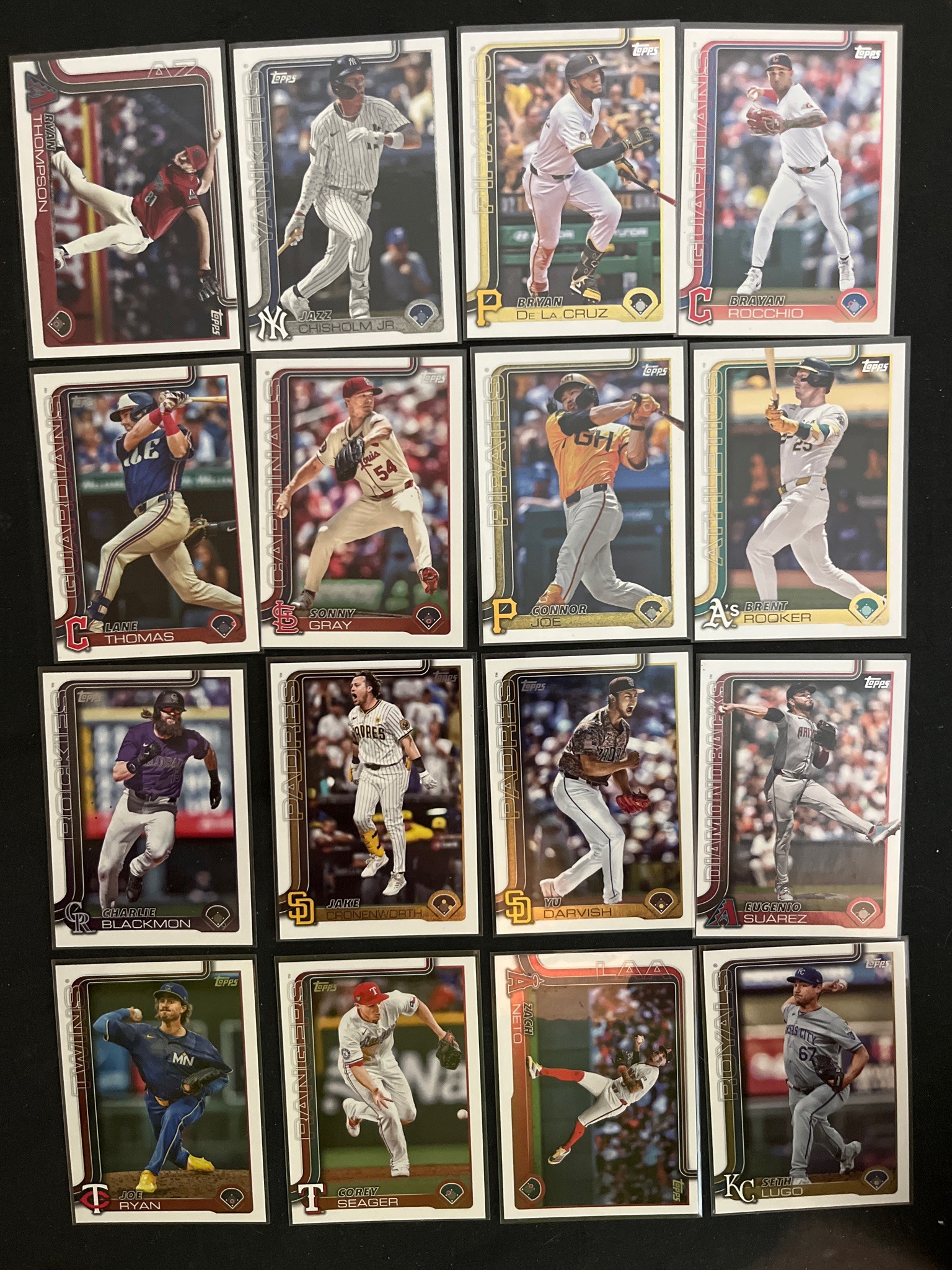 A collection of 16 modern Major League Baseball trading cards from the 2024 Topps series, organized in a 4x4 grid. Each card is standard size (2.5 by 3.5 inches) and constructed from laminated cardstock with a glossy finish. The set includes a mix of base cards and several 'Gold' border parallel variations, which are typically serial-numbered limited editions characterized by a distinct golden-yellow frame around the player image. Notable players featured include Jazz Chisholm Jr. (Yankees), Corey Seager (Rangers), Yu Darvish (Padres), and Sonny Gray (Cardinals). The cards are in excellent condition, appearing freshly pulled from packs and strictly stored inside protective clear penny sleeves. There are no visible signs of surface scratching, corner dinging, or edge whitening. The printing features high-definition action photography with vibrant colors and crisp team logos in the bottom corners and vertical team names along the left borders. The 'Topps' brand logo is visible in the upper right or left corners of each card. The collection represents current-year manufacturing with modern graphic design elements including sleek geometric borders and integrated player nameplates at the bottom.