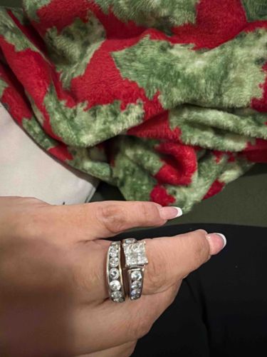 This is a two-piece wedding set consisting of a princess-cut diamond engagement ring and a coordinating channel-set anniversary or wedding band. The engagement ring features a prominent, square princess-cut center stone secured by four prominent V-shaped corner prongs, which are a hallmark of this cut to protect the vulnerable edges. The shank of the engagement ring is a channel-set design containing approximately four to five round-cut side stones on the visible side. The accompanying wedding band is a matching channel-set band featuring roughly seven visible round-cut stones. The metal appears to be a white-colored precious metal, likely 14k or 18k white gold, or possibly platinum, exhibiting a high-polish finish. The design style is contemporary, popular in the late 1990s through the 2010s. The stones appear to be high-luster, suggesting they are either natural diamonds or high-quality stimulants like cubic zirconia. In terms of condition, there is minor superficial scuffing visible on the metal surface consistent with daily wear. The prongs appear intact, though a physical inspection would be needed to ensure the center stone is tight. No significant chips or cracks are immediately visible on the stones from this angle.