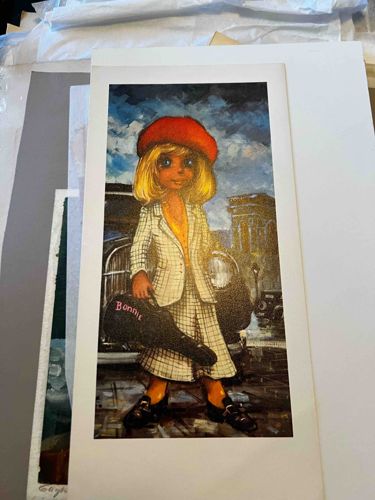 This is a vertical art print depicting a stylized young woman in the iconic 'Big-Eye' artistic movement popularized by painters like Margaret Keane and Eve Licea in the 1960s and 1970s. The subject, likely intended to represent Bonnie Parker from the duo Bonnie and Clyde, is portrayed with an oversized head and large, expressive eyes that dominate her facial features. She is dressed in a white and black windowpane-check suit with a matching skirt, a yellow blouse, and a distinctive bright red beret. She holds a black instrument case (likely for a violin or submachine gun) with the name 'Bonnie' written in pink script. The background features a moody, textured atmospheric sky over a vintage automobile and architectural elements suggestive of a mid-20th-century urban setting. The medium appears to be a lithographic or offset print on white cardstock or heavy paper, shown with a wide white border. The condition of the print appears good with no obvious tears, though there is slight natural aging of the paper at the edges. The brushstrokes visible in the image suggest the reproduction of an original oil or acrylic painting. This piece embodies the mid-century kistch aesthetic, blending innocence with a notorious historical theme.