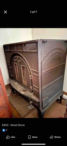 This is a heavy-duty, cast iron wood-burning stove, identifiable by the signature arched double-door aesthetic characteristic of the Vermont Castings 'Defiant' model. The unit is constructed from thick, dark grey/black cast iron panels featuring deep decorative moldings and architectural arch details on both the front and side panels. It sits on four short, sturdy cabriole-style integrated legs. The front facade features two vertical glass viewing panes set within the arched doors, which are operated by cylindrical handles. Below the doors, a decorative hearth extension plate is visible, likely containing an ash lip. The condition appears well-used but structurally sound; there is significant visible surface oxidation (rust/patina) particularly on the side panels and top, indicating it has not been polished recently. The glass panes appear somewhat soot-stained or clouded from past use. The manufacturing style suggests a late 20th-century production, likely dating from the late 1970s to the 1980s. The craftsmanship is high-quality, typical of American-made cast iron heating appliances of that era, designed for high thermal mass and longevity. No specific maker's mark is visible from this angle, but the pattern is iconic to the Vermont Castings brand.