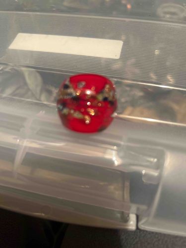 This item is a spherical Murano-style art glass lampwork bead, likely intended for jewelry making. The bead features a vibrant opaque red glass core, decorated with an intricate internal landscape of 'millefiori' (a thousand flowers) cane slices and sparkling aventurine copper flecks. The colors within the decorative inclusions consist of deep cobalt blue, white, and hints of yellow, creating a complex, multicolored band around the center of the sphere. The construction indicates handmade lampwork techniques where individual glass canes are fused onto a molten base. The surface appears polished and smooth with high luster, indicative of quality kiln-annealing. While the image is slightly out of focus, the bead seems to be in excellent condition with no visible surface chips or fractures. Such beads are traditional exports from Venice, Italy, often dating from the late 20th century to the contemporary period. The craftsmanship reflects the labor-intensive 'sommerso' or submerged layering technique, common in Venetian art glass. It possesses a vertical drill hole for stringing, often measuring approximately 1-2mm in diameter. The overall aesthetic is one of traditional artisanal glassblowing, characterized by bright primary colors and metallic inclusions.