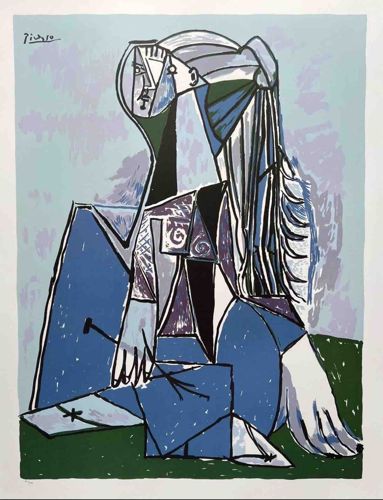 This item is a color lithograph on paper, a stylized cubist interpretation of a seated woman, after the original 1954 oil painting by Pablo Picasso. The composition features a woman with long hair, rendered in a palette of blues, greens, greys, and blacks. The figure is fragmented in a classic late cubist / surrealist manner, with a profile and frontal view merged in the face. She is depicted holding a pen over what appears to be a writing surface. The background consists of broad, textured applications of lavender and pale blue, creating a sense of shallow space. Notable features include a printed 'Picasso' signature in the upper left corner and common pencil numbering in the lower left margin, indicating this is part of a limited edition. The linework is bold and expressive, mimicking the woodcut or linocut style often employed by Picasso in his printmaking. The condition appears stable with vibrant colors, though there is a slight variability in the paper tone near the edges consistent with age and typical framing exposure. The craftsmanship reflects the mid-20th-century lithographic techniques used to reproduce iconic modern masterworks for the collector's market.