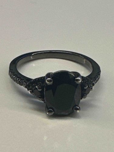 This contemporary ring features a prominent oval-cut black gemstone, likely a black onyx, spinel, or heat-treated diamond, held in a four-prong setting. The central stone is faceted to maximize surface reflection and is flanked by a trio of smaller round black accent stones on each shoulder, leading into a pavé-set band. The entire piece is constructed from a dark, gunmetal-toned metal, which appears to be black rhodium plating over sterling silver or gold. This dark finish creates a monochromatic, gothic-inspired aesthetic. The craftsmanship displays precise prong placement and uniform stone setting along the shank. No hallmark is visible in the photograph, but the high-polish finish on the interior shank suggests a modern production, likely within the last 10-15 years. The condition appears excellent with minimal signs of wear to the plating and no visible chips or fractures to the gemstones. The design balances a classic oval silhouette with a bold, alternative color palette, making it a distinctive piece of fashion jewelry or an alternative engagement ring.