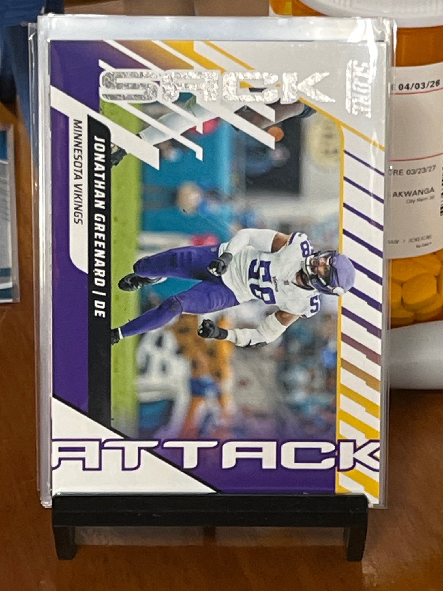 This is a 2024 Panini Score modern trading card featuring Jonathan Greenard of the Minnesota Vikings. The card is a specialized 'SACK ATTACK' insert, characterized by its dynamic horizontal layout and bold graphic elements. The design utilizes a theme-appropriate color palette of purple, gold, and white, mirroring the Vikings' team colors. The silver foil 'SACK' text at the top and purple 'ATTACK' at the bottom frame a crisp action photograph of Greenard in his white away uniform. Physically, the card is standard 2.5 x 3.5 inches, constructed from thick cardstock with a glossy finish. It is currently housed in a protective soft plastic sleeve and a semi-rigid top loader, which helps maintain its condition. The centering appears well-balanced, and the corners, visible through the sleeve, appear sharp without obvious whitening or fraying. There are no immediate signs of surface scratches, creases, or manufacturing defects visible in this view. The vertical 'SCORE' logo is present in silver foil in the upper right. This represents a modern collectible from a major licensed manufacturer, often used as part of a subset in the larger Score set release for the 2024 season.