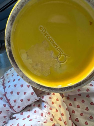This is a detailed view of the underside or base of a glazed ceramic decorative item, possibly a mug, canister, or vase, produced by Department 56. The base is finished in a bright, vibrant glossy yellow glaze, which covers the entire recessed center. The most prominent identification feature is the incised or stamped '© Department 56' logo located in the center, signifying it as an authentic product from this popular collectible brand. The logo is rendered in a modern, stylized font consistent with their late 20th-century branding. Regarding condition, there is a significant patch of textured adhesive residue or a partially removed paper label near the center bottom, which obscures a portion of the surface. The unglazed ceramic foot rim shows noticeable darkening and surface grime, suggesting frequent movement or use. There are also small dark specks and a few minor orange-toned spots visible within the yellow glaze, which may be kiln debris or slight surface contaminants. The construction is a heavy-duty earthenware or stoneware, typical of Department 56 giftware. The item appears to date from the late 1980s to the early 2000s, given the logo style and glaze quality. The round shape and sturdy foot rim indicate a functional vessel or a stationary tabletop decorative piece.