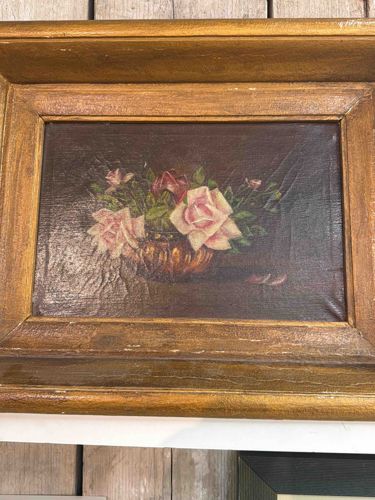This item is a representational floral still life oil painting on canvas, housed in a wide, beveled wooden frame with a gold-leaf or metallic gilt finish. The composition features a cluster of pink and red roses arranged in a globular metallic or ceramic vase against a dark, monochromatic umber background. The brushwork exhibits a modest level of detail, characteristic of early to mid-20th-century decorative art. The canvas shows significant signs of age and wear, including prominent horizontal and vertical cracking (craquelure) and visible rippling of the fabric substrate, particularly on the right side. The frame displays various condition issues such as surface abrasions, scuffing along the ridges, and areas of pigment loss revealing the underlying gesso or wood. Measuring approximately small to medium cabinet size, the piece reflects a traditional 1900-2000 aesthetic found in amateur or semi-professional interior decor paintings. No visible artist signature or maker's mark is present in the provided view, suggesting it may be a student work or a mass-produced decorative piece from that era.