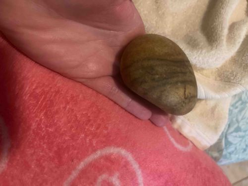 This item is an oval-shaped, naturally water-worn cobble, measuring approximately 2 to 3 inches in length based on its scale relative to the palm of a human hand. The specimen displays a tan to ocher base color with distinct sedimentary banding or stratification appearing as darker, brownish-grey horizontal layers across its body. These parallel bands suggest a sedimentary origin, likely a siltstone or fine-grained sandstone. The surface texture appears smooth and matte, indicative of long-term alluvial abrasion or 'river tumbling' which has rounded all sharp edges into a comfortable, ergonomic form. There are no visible maker's marks, signatures, or human alterations, identifying it as a naturally occurring geologic object rather than a manufactured tool or artifact. The condition is excellent for a natural specimen, showing no significant fractures, chips, or modern tool marks, though it possesses a natural, earthy patina and fine surface pitting consistent with geological aging. While it mimics the shape of certain lithic tools, such as a grinding stone or 'mano,' the lack of specific wear patterns on the flat faces suggests it is a natural river rock. Its age is geological, likely spanning millions of years in formation, though its current polished state is the result of more recent environmental wear.