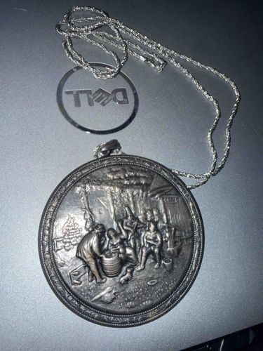 This is a large, circular medallion pendant, likely made of silver-toned metal, possibly pewter or silver-plated base metal, suspended from a slender braided or rope-style chain. The medallion's face features a high-relief embossed scene in an 18th-century Dutch or Flemish genre style, reminiscent of painters like Adriaen van Ostade or David Teniers the Younger. The scene depicts a gathering of figures in what appears to be a rustic interior or tavern setting; one figure stands over a barrel while others sit nearby, possibly engaged in drinking and merrymaking. The composition includes architectural elements like a thatched roof or eaves in the background and a detailed ground plane. The border of the medallion is intricately decorated with a recurring foliate or scrollwork pattern within a beaded rim. In terms of condition, there is a visible dark patina and heavy oxidization in the recessed areas (crevices), which enhances the depth of the relief but indicates age and lack of recent polishing. The pendant is equipped with a functional bail at the top. The overall craftsmanship suggests a mid-20th-century decorative souvenir or a piece of 'revival' costume jewelry rather than a period antique. No distinct maker’s marks or purity stamps are visible in this orientation.