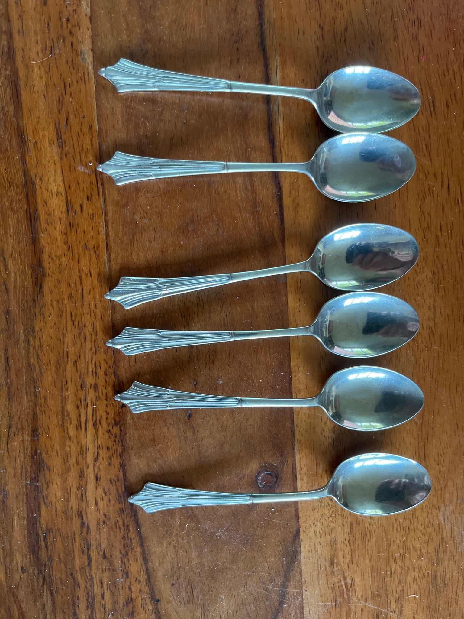 This is a cohesive set of six antique hallmarked sterling silver teaspoons, featuring a classic Art Deco influence in the handle design. Each spoon measures approximately 10 to 12 centimeters in length and is constructed from solid silver, indicated by the metallic luster and reflected highlights. The handles are characterized by a 'fanned' or 'sunburst' terminal with linear fluting that transitions into a slender, plain stem and tapers towards an oval-shaped bowl. The craftsmanship demonstrates precision, with symmetrical cast or stamped detailing on the terminals. While the specific hallmarks (maker's mark, town mark, and date letter) are located on the reverse side and not fully visible in the frontal view, the set presents the high-quality finish associated with professional silversmithing from the early 20th century, likely between 1920 and 1940. The condition appears very good; there is minimal visible tarnishing, suggesting they have been well-maintained. Light surface scratches and minor 'pitting' consistent with age and polishing are evident upon close inspection. There are no signs of significant bending, bowl thinning, or structural repairs, which preserves the set's functional and collectible value. The uniform appearance suggests they have remained together since their initial manufacture.
