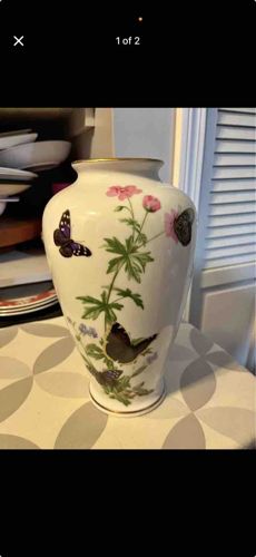 This is a fine white porcelain baluster-shaped vase featuring a botanical and lepidoptera (butterfly) motif. The vase is crafted from high-quality glazed white porcelain with a slightly tapered base and a flared rim. The decoration showcases a central branch of pink flowers and green foliage, surrounded by several realistically rendered butterflies in shades of dark brown, purple, and blue. The rim and base are accented with hand-applied 24k gold gilding, showcasing fine craftsmanship. The style and motif are characteristic of the Kaiser Porcelain company from Germany, specifically the 'Dubarry' or 'Papillon' series designed by artist K. Nossek, likely dating from the mid-to-late 20th century (circa 1970s-1980s). Physically, the item appears to be in excellent vintage condition with no visible cracks, chips, or significant crazing. The colors remain vibrant, and the gold trim shows minimal wear, indicating it was likely a display piece rather than a functional vessel. The porcelain exhibits a smooth, high-gloss finish typical of high-end German ceramic production.